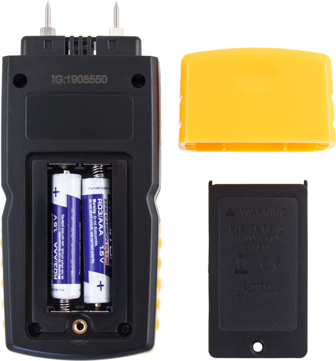 Прибор для проверки процентного влагосодержания в изделиях из древесного сырья. Большой ЖК- дисплей. Для предотвращения травмирования измерительными иглами предусмотрен защитный колпачок. Диапазон измерения влажности 5 ... 70%
