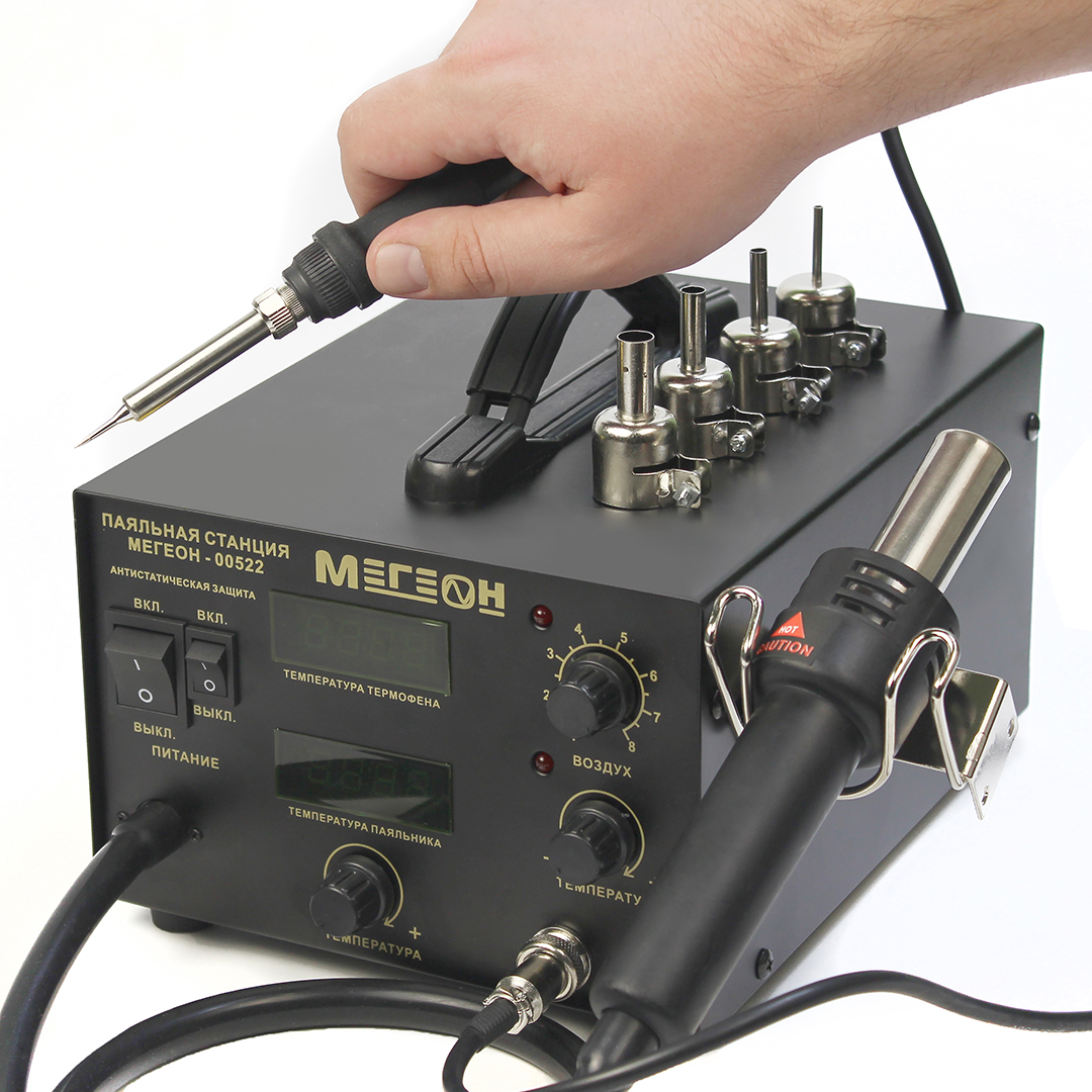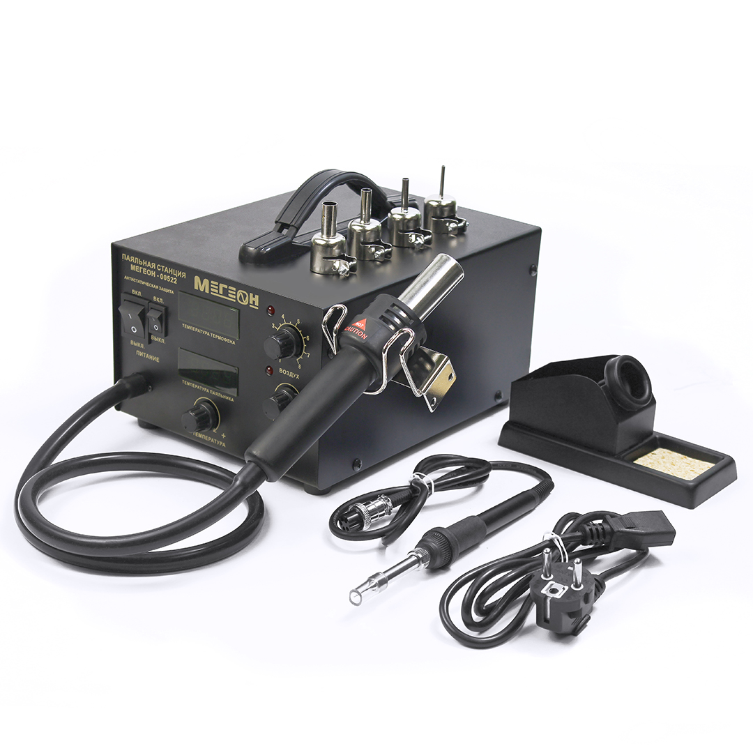 Паяльная станция, состоящая из классического компрессорного термофена и паяльника. Аналоговое управление установки температуры и потока воздуха, цифровая индикация и стабилизация температуры. 4 наконечника для термофена в комплекте.