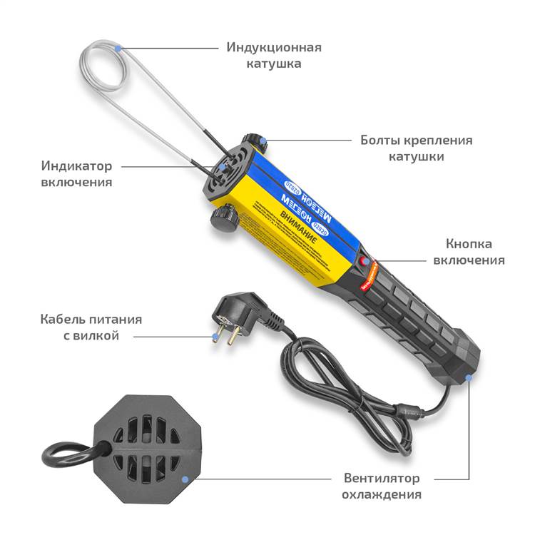 Для универсальности применения нагреватель оснащён съёмными насадками различного диаметра, которые легко заменяются в зависимости от типа и размеров детали. В комплекте поставляется восемь катушек, позволяющих адаптировать прибор под конкретные задачи. Устройство также комплектуется прочным кейсом для удобного хранения и транспортировки, что делает его незаменимым помощником как для профессионалов, так и для любителей.